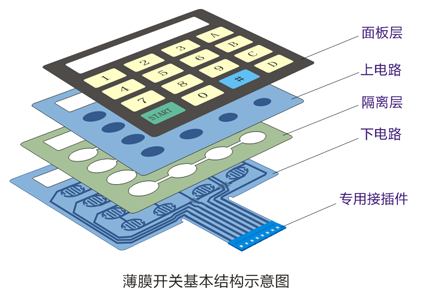 薄膜開(kāi)關(guān)是20世紀80年代發(fā)展起來(lái)的新型電子器件,是電子整機產(chǎn)品新的操縱系統,由三層或多層不同質(zhì)地的薄膜粘合而成的密封整體,具有體積小、重量輕、密封好、外觀(guān)新穎、裝聯(lián)方便等特點(diǎn),因而產(chǎn)品順應電子時(shí)代向多功能、密集型、智能化發(fā)展的需要。