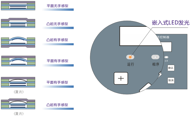 1、平面無(wú)手感型2、平面有手感型 3、凸鍵無(wú)手感型 4、凸鍵有手感型 5、LED貼片薄膜開(kāi)關(guān) ![]() |